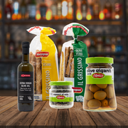 Kapern, Oliven und zwei Sorten Grissini treffen auf natives Olivenöl Extra. Ein vielseitiges Set, das mediterrane Vorspeisen und kleine Snacks stilecht abrundet.