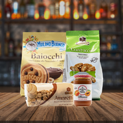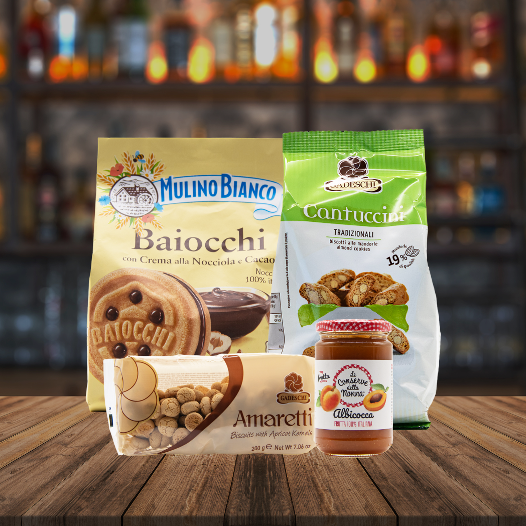 Knusprige Cantuccini, feine Amaretti mit Aprikosenkern, fruchtige Aprikosenkonfitüre und Baiocchi Kekse mit Haselnusscreme. Eine abwechslungsreiche Auswahl, die perfekt zu Kaffee, Tee oder als kleine Nascherei zwischendurch passt.