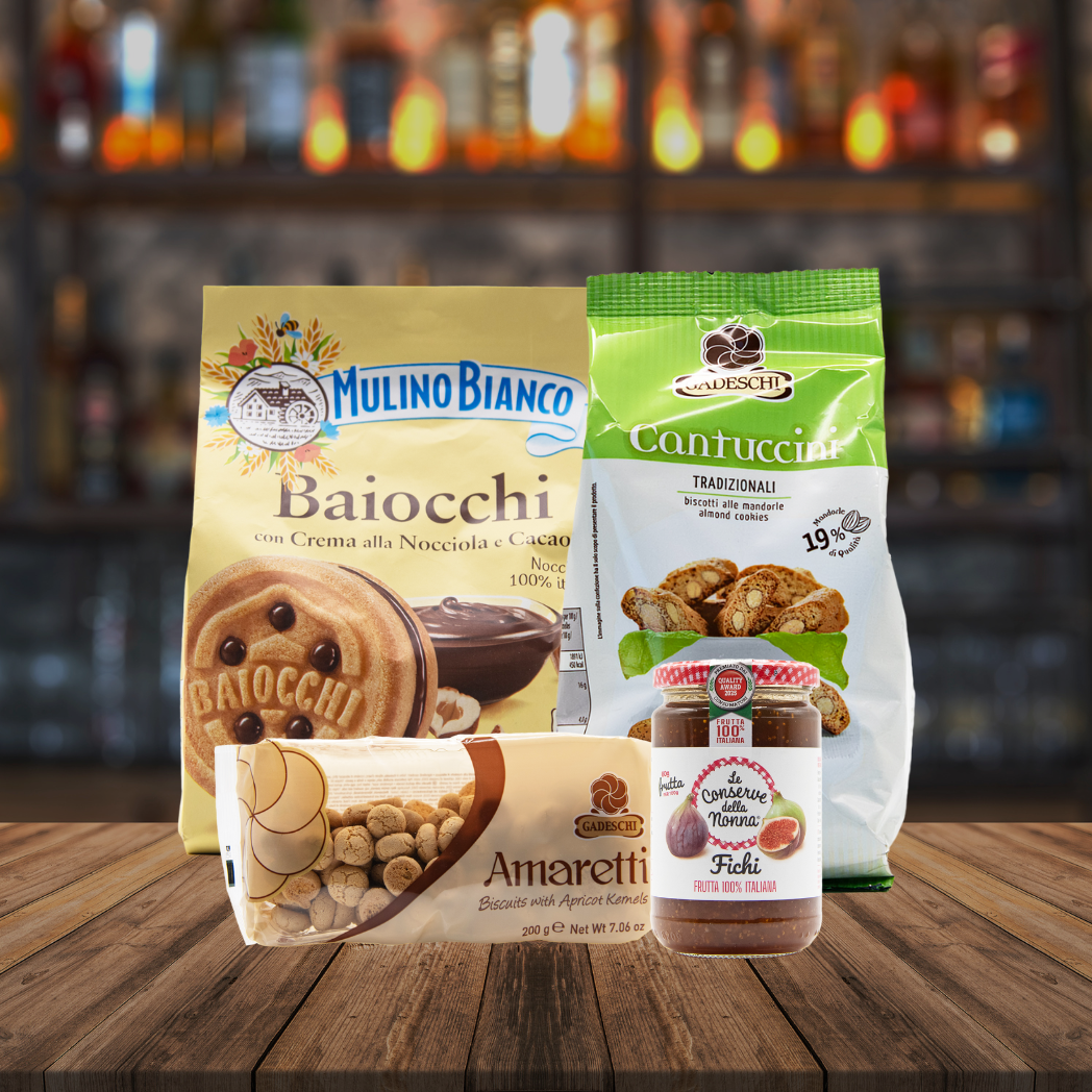 Knusprige Cantuccini, feine Amaretti mit Aprikosenkern, fruchtige Feigekonfitüre und Baiocchi Kekse mit Haselnusscreme. Eine abwechslungsreiche Auswahl, die perfekt zu Kaffee, Tee oder als kleine Nascherei zwischendurch passt.