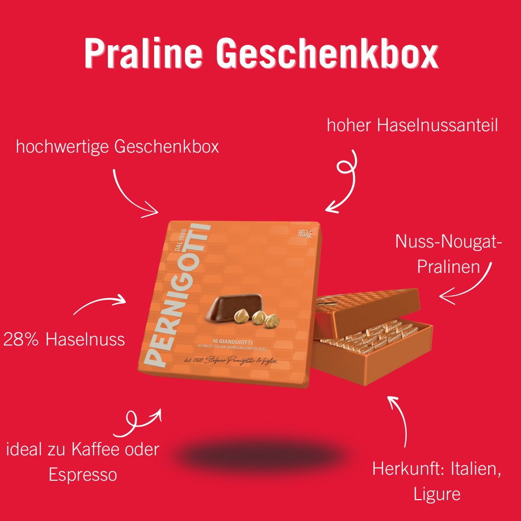 Eine Geschenkbox, gefüllt mit den klassischen Nuss-Nougat-Pralinen von Pernigotti.